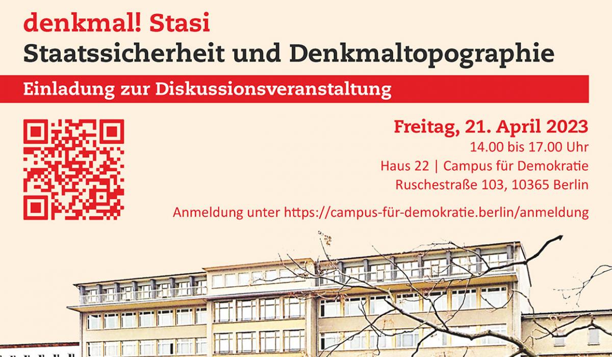 Aus dem Ministerium für Staatssicherheit der DDR in Berlin-Lichtenberg soll der Campus für Demokratie werden. Seit 2022 stehen weite Teile des Geländes unter Denkmalschutz. Zugleich werden die kommenden Jahre bauliche Veränderungen mit sich bringen, um Altes neuen Anforderungen anzupassen und neue Nutzungen einzufügen. In der Veranstaltung mit dem Titel "denkmal! Stasi | Staatssicherheit und Denkmaltopographie" möchten wir gemeinsam mit Ihnen materielle Aspekte des Ortes (z.B. Bauten der Stasi) und immaterielle Aspekte der Authentizität diskutieren.